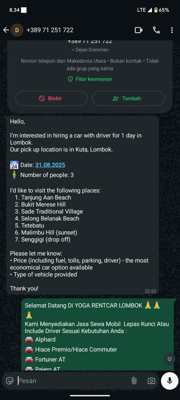 “Harga transparan tanpa biaya tersembunyi. Sopir juga tepat waktu dan sangat memahami rute wisata. Recommended banget buat yang baru pertama ke Lombok.”