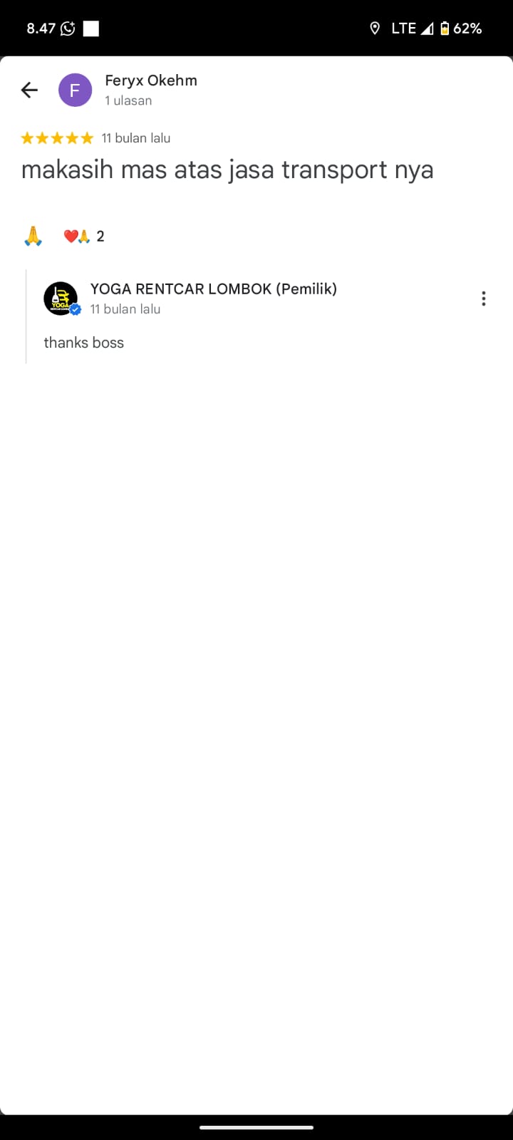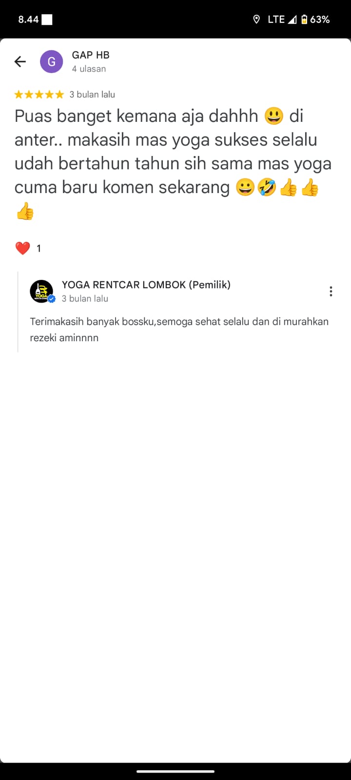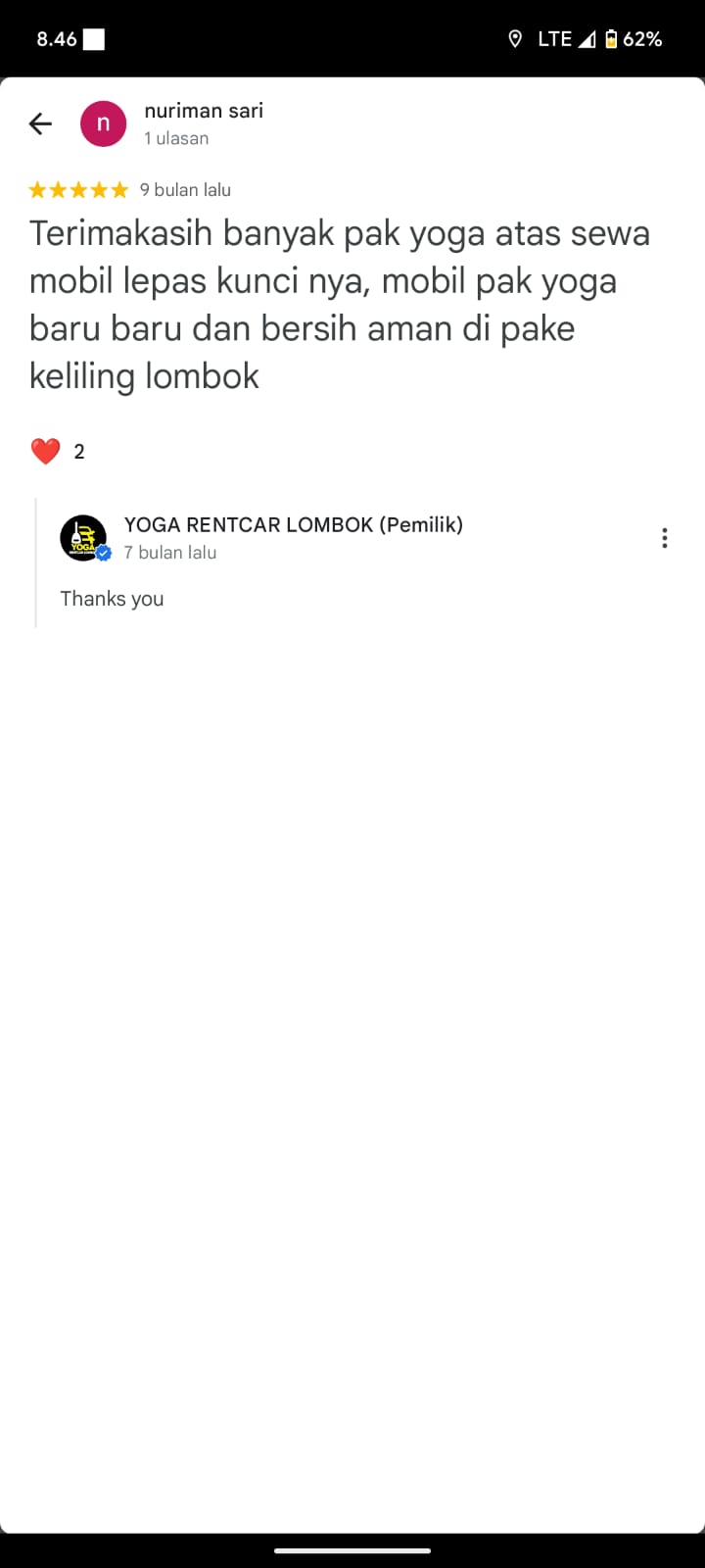 “Terima kasih Yoga Rentcar Lombok. Layanan yang ramah, mobil nyaman, dan harga bersahabat. Cocok untuk keluarga besar seperti kami.”