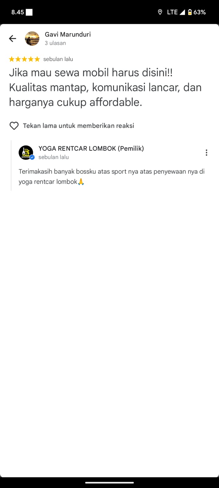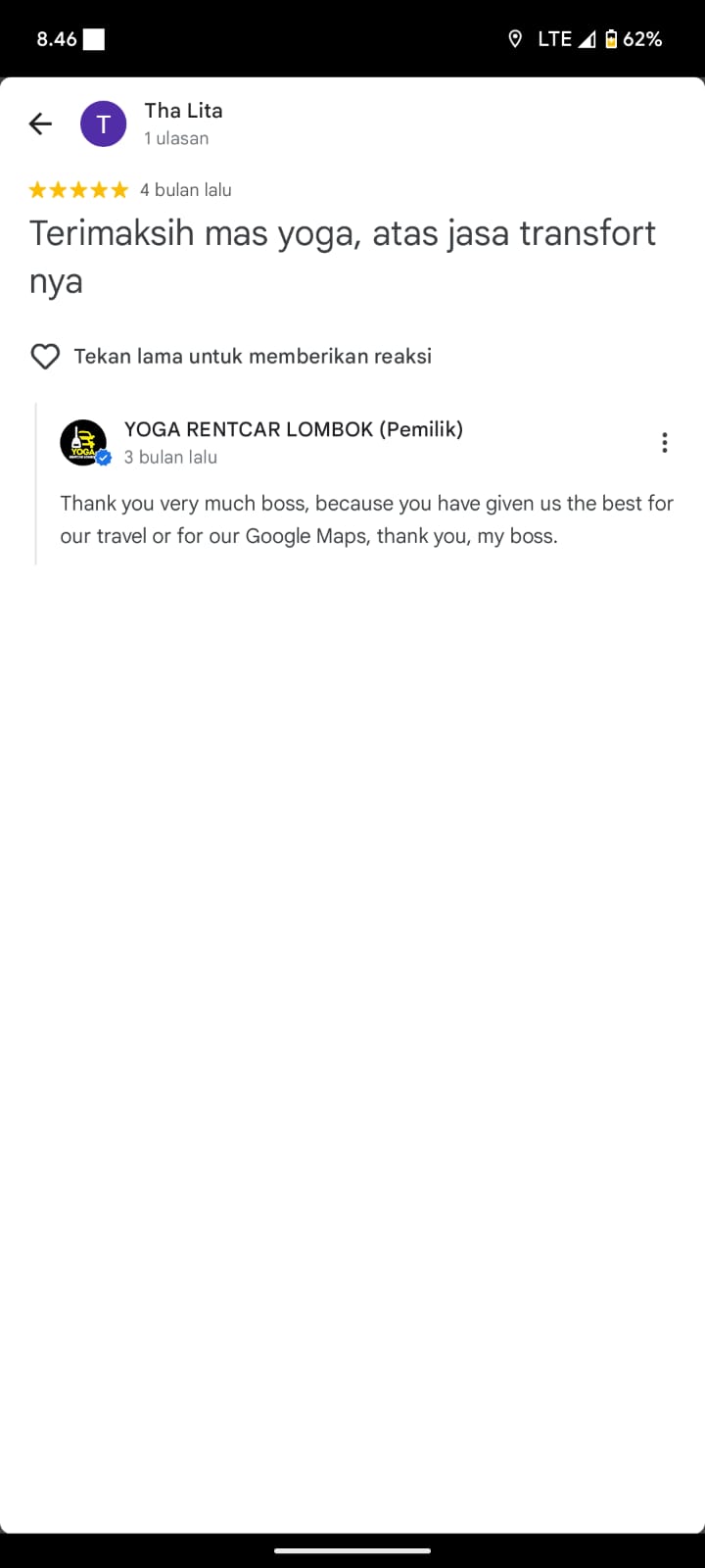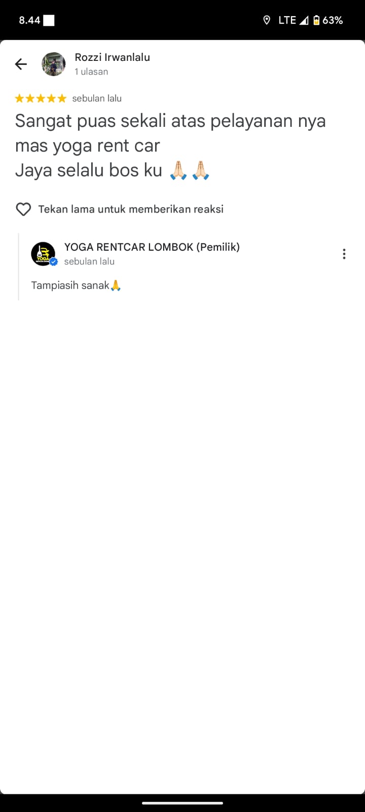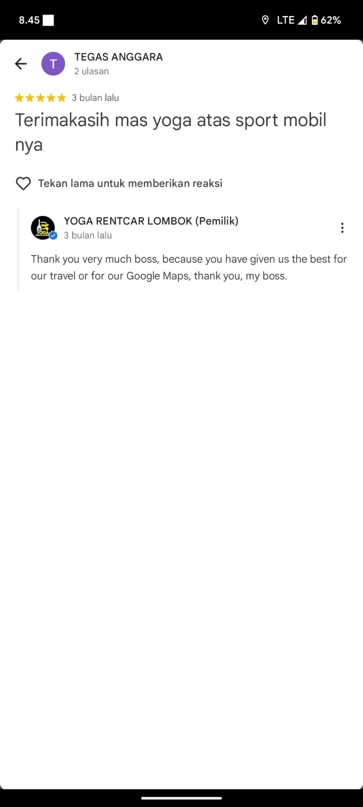 “Terima kasih Yoga Rentcar Lombok. Layanan yang ramah, mobil nyaman, dan harga bersahabat. Cocok untuk keluarga besar seperti kami.”